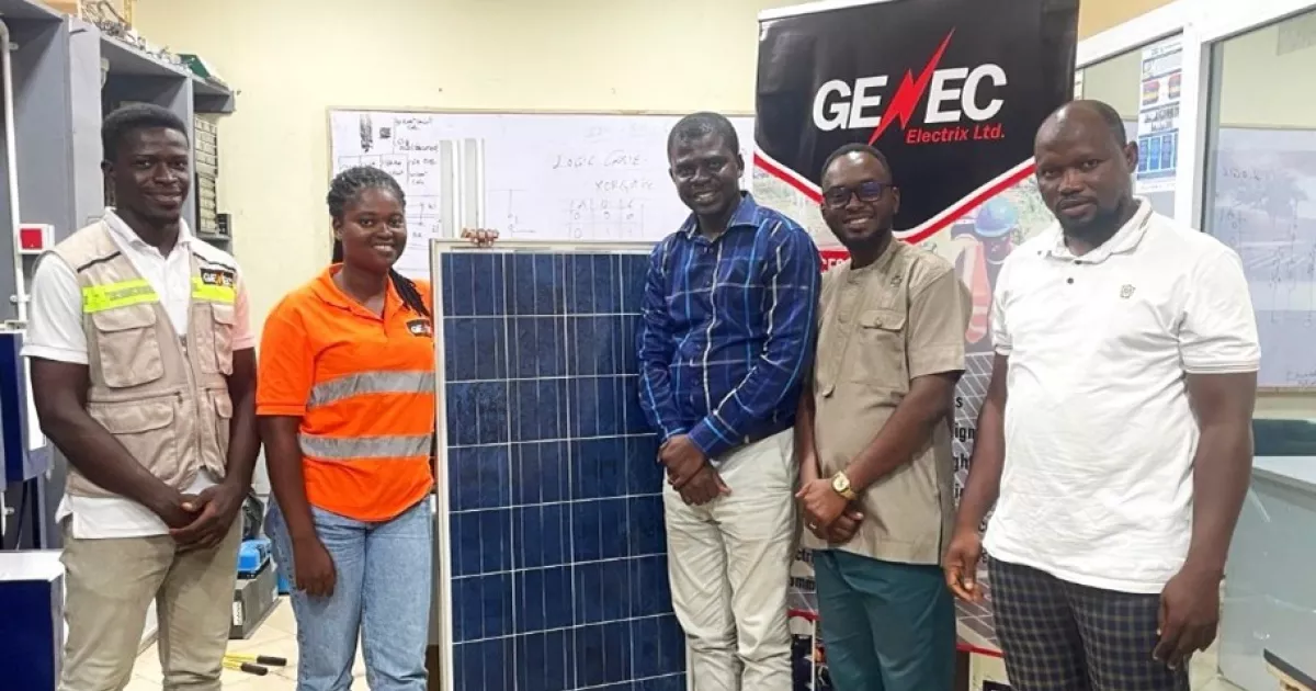 Five people are standing indoors around a large solar panel, with a "GENEC Electrix Ltd." banner behind them. The setting is an office with technical drawings on a whiteboard in the background.